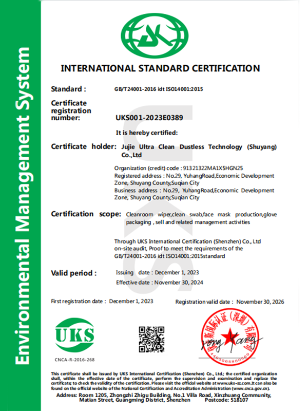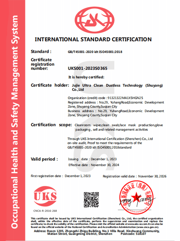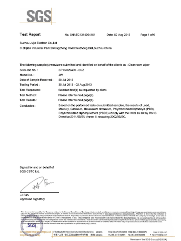 Periksa apakah produk tersebut telah lulus sertifikasi industri Cleanroom. Semua barang habis pakai di Suzhou Jujie Electronics memenuhi standar ISO Kelas 5/6 dan memberikan laporan pengujian pihak ketiga.