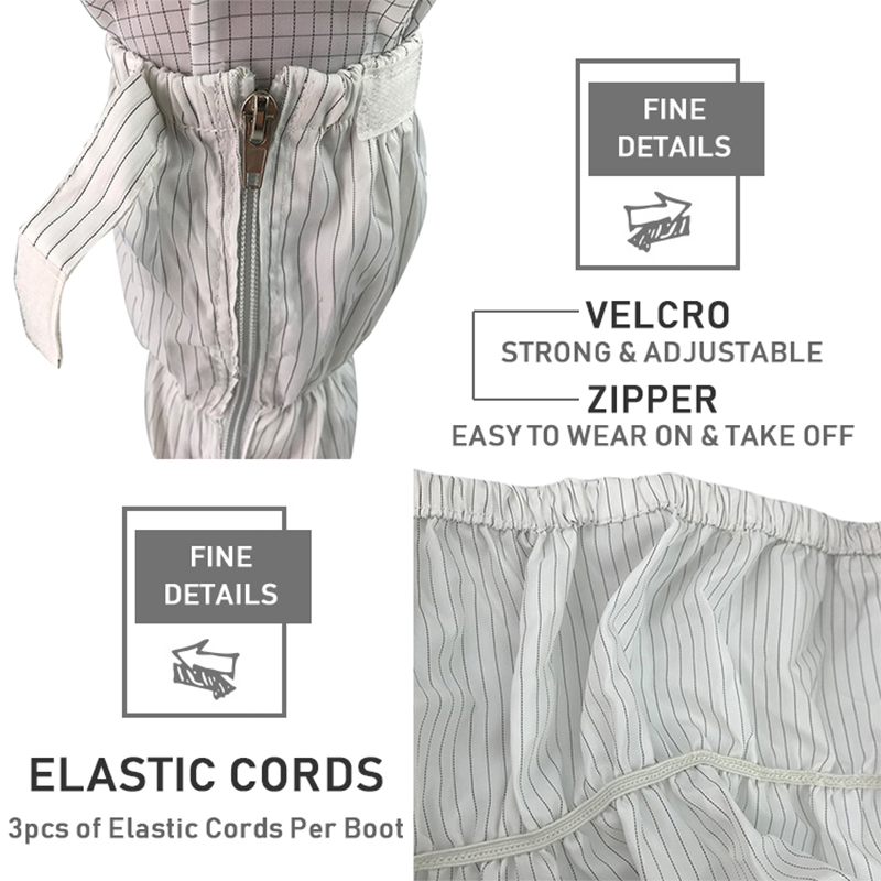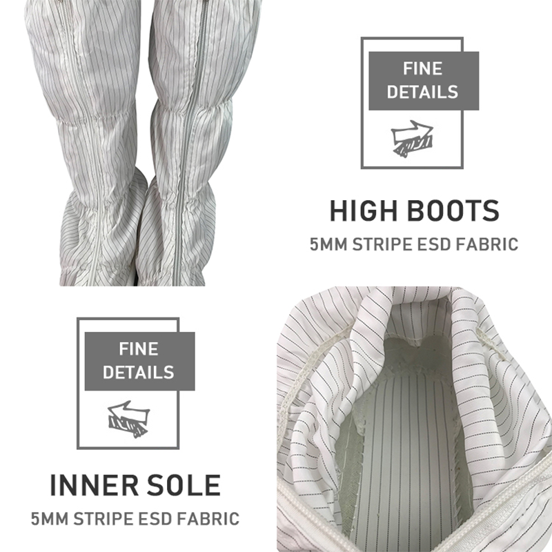 Sepatu bot anti-statis Cleanroom dirancang dengan nyaman dalam pikiran. Penggunaan material EVA membuat sepatu bot lebih lembut dan memiliki efek penyerapan kejut yang baik, yang mengurangi dampak pada kaki dan tidak menyebabkan kelelahan setelah dipakai jangka panjang. Lapisan boot terbuat dari bahan bernapas untuk memastikan kaki kering dan semakin meningkatkan kenyamanan memakai.